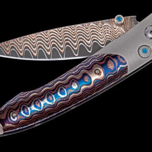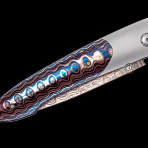 The Lancet B10 Blue Wave Knife features a light and resilient frame, which is machined from aerospace grade titanium, then finished with a fine blast-polishing. The inlay is heat-blued ‘Wave’ mokume. The blade is done in William Henry’s signature ‘Copper Wave’ damascus steel, with an extra sharp core in VG-5 steel. The one-hand button lock and thumb stud are set with Kashmir blue topaz gemstones. Sleek, elegant, refined, and comfortable in the hand and to the eye, the Lancet defines the essential gentleman’s folder in the modern world. The ‘Black Cove’ features some of the exotic materials, artistry and hand-forged metals that are the hallmark of William Henry’s collections; a timeless heirloom to be proudly worn and used for a lifetime before being handed-down to another generation.