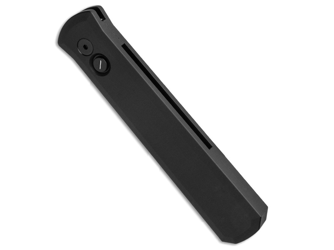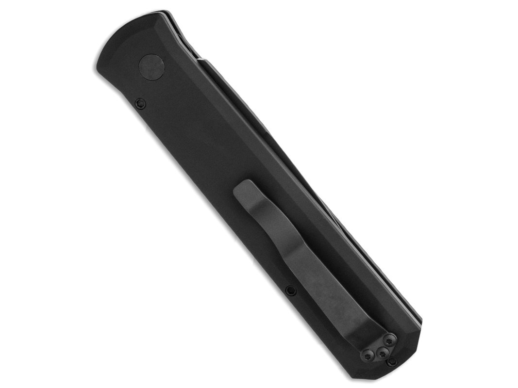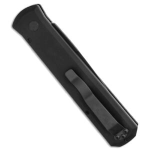Solid black aluminum handle, sterile black 4” 154-cm blade, with tritium inlay push button, all black hardware, and black clip. This awesome 4″ blade auto knife represents the influence of original Italian “Stiletto” style auto knife and Pro-Tech’s modern coil spring precision. The Godfather production auto knives feature T6-6061 aluminum handles that are machined from solid black stock. Production Godfather blades are four inches in length and generally 154-CM stainless steel that are heat treated to 59RC.